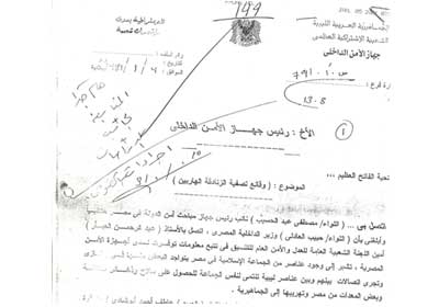 وجاءت الوثيقة التي نشرتها صحيفة «الشروق» تحت عنوان «وقائع تصفية الزنادقة الهاربين»، وشعار «سرية جدا»، كتب مدير فرع جهاز الأمن الداخلى فى بنغازى العميد السنوسى سليمان إلى رئيس الجهاز وإدارة مكافحة الزندقة قائلا: «اتصل بى اللواء (.....) نائب رئيس جهاز أمن الدولة فى مصر هاتفيا، وأبلغنى بأن اللواء حبيب العادلى وزير الداخلية المصرى اتصل بالأستاذ عبدالرحمن العبار أمين اللجنة الشعبية العامة للعدل والأمن العام، للتنسيق فى تتبع معلومات توافرت لدى أجهزة الأمن المصرية».