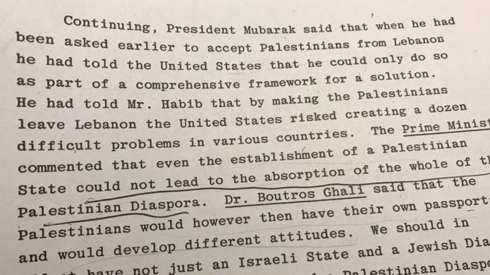 وحسب محضر جلسة المباحثات فإن مبارك "قال إنه عندما طُلب منه في وقت سابق أن يقبل فلسطينيين من لبنان ، فإنه أبلغ الولايات المتحدة أنه يمكن أن يفعل ذلك فقط كجزء من إطار عمل شامل لحل".
